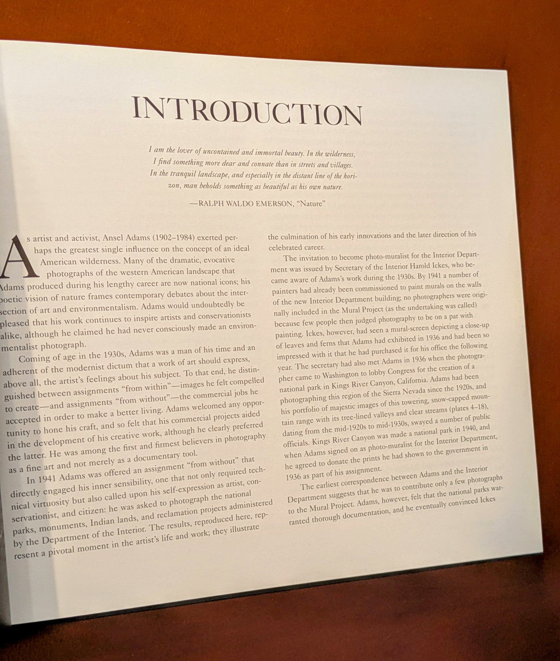 “ In 1941 Ansel Adams was hired by the United States Department of the Interior to photograph America's national parks for a series of murals that would celebrate the country's natural heritage. Because of the escalation of World War II, the project was suspended after less than a year, but not before Adams had produced this group of breathtaking images, which illustrate both his early innovations and the shape of his later, legendary career as America's foremost landscape photographer. In these glorious, seminal images we see the inspired reverence for the wilderness that has made Ansel Adams's work a most enduring influence on the intertwining spirits of art and environmentalism, both so necessary for the preservation of our natural world.” - Publisher