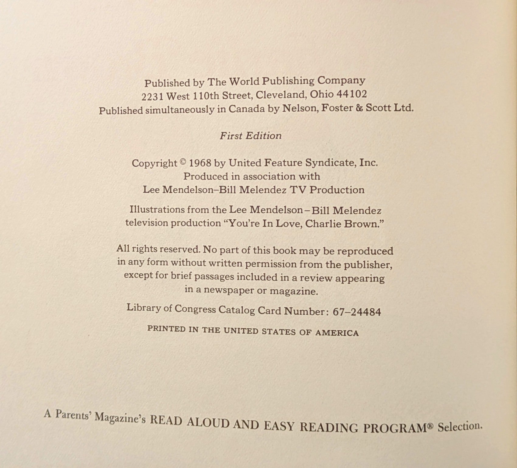 CHARLES SCHULZ "YOU'RE IN LOVE CHARLIE BROWN" PICTUREBOOK FIRST US EDITION 1968