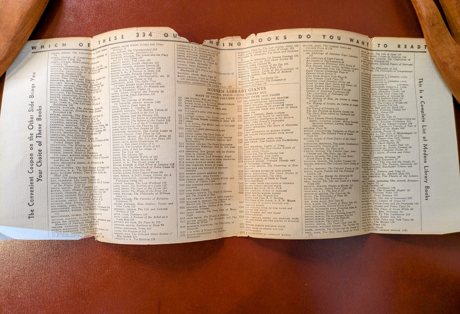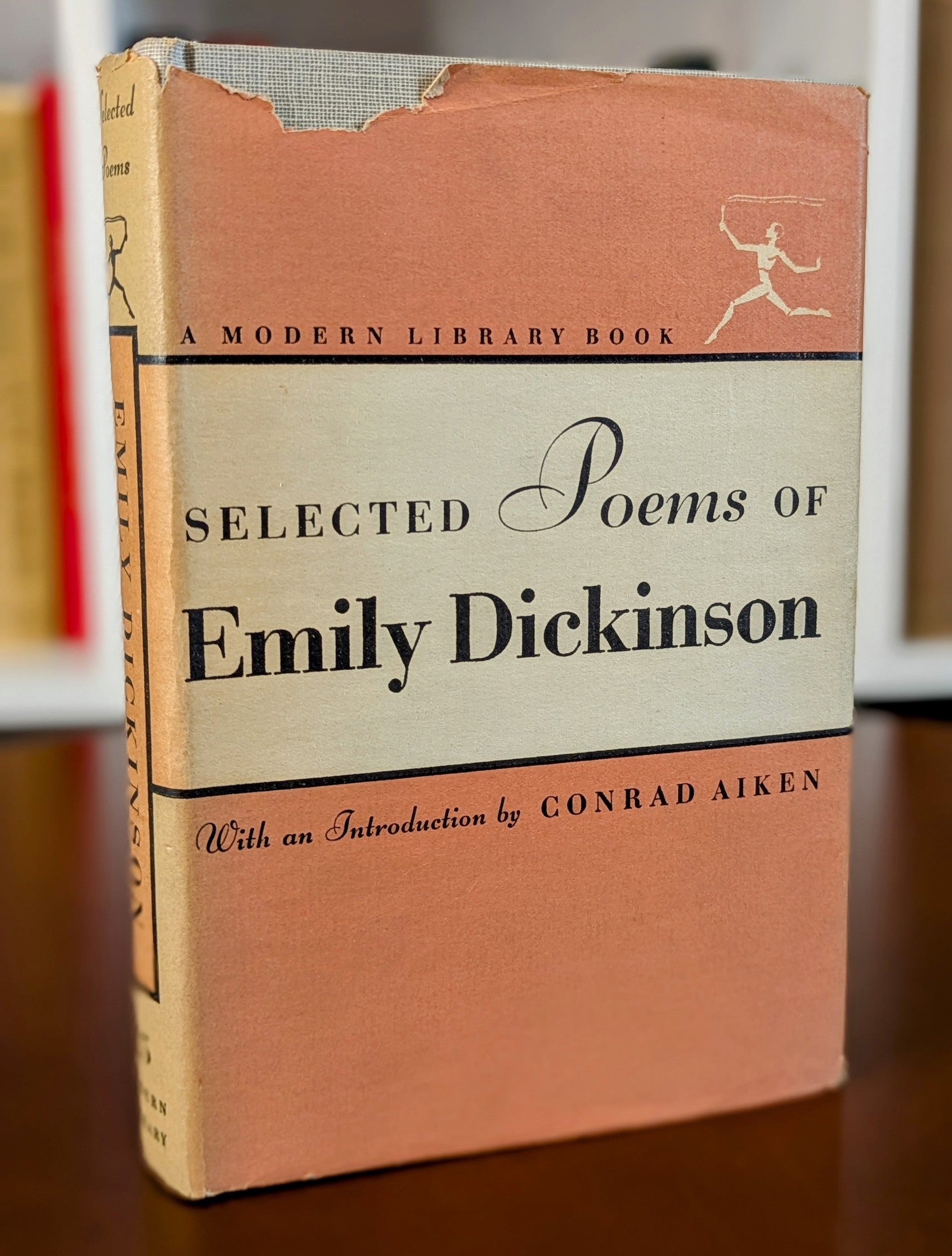 The first volume of Emily Dickinson’s poetry was published in 1890, four years after her death. Modern Library is a publishing house founded in 1917 to provide American readers with inexpensive reprints of European modernist titles plus the work of a few contemporary Americans. This copy is the First Modern Library Edition of the “Selected Poems of Emily Dickinson” from 1948.