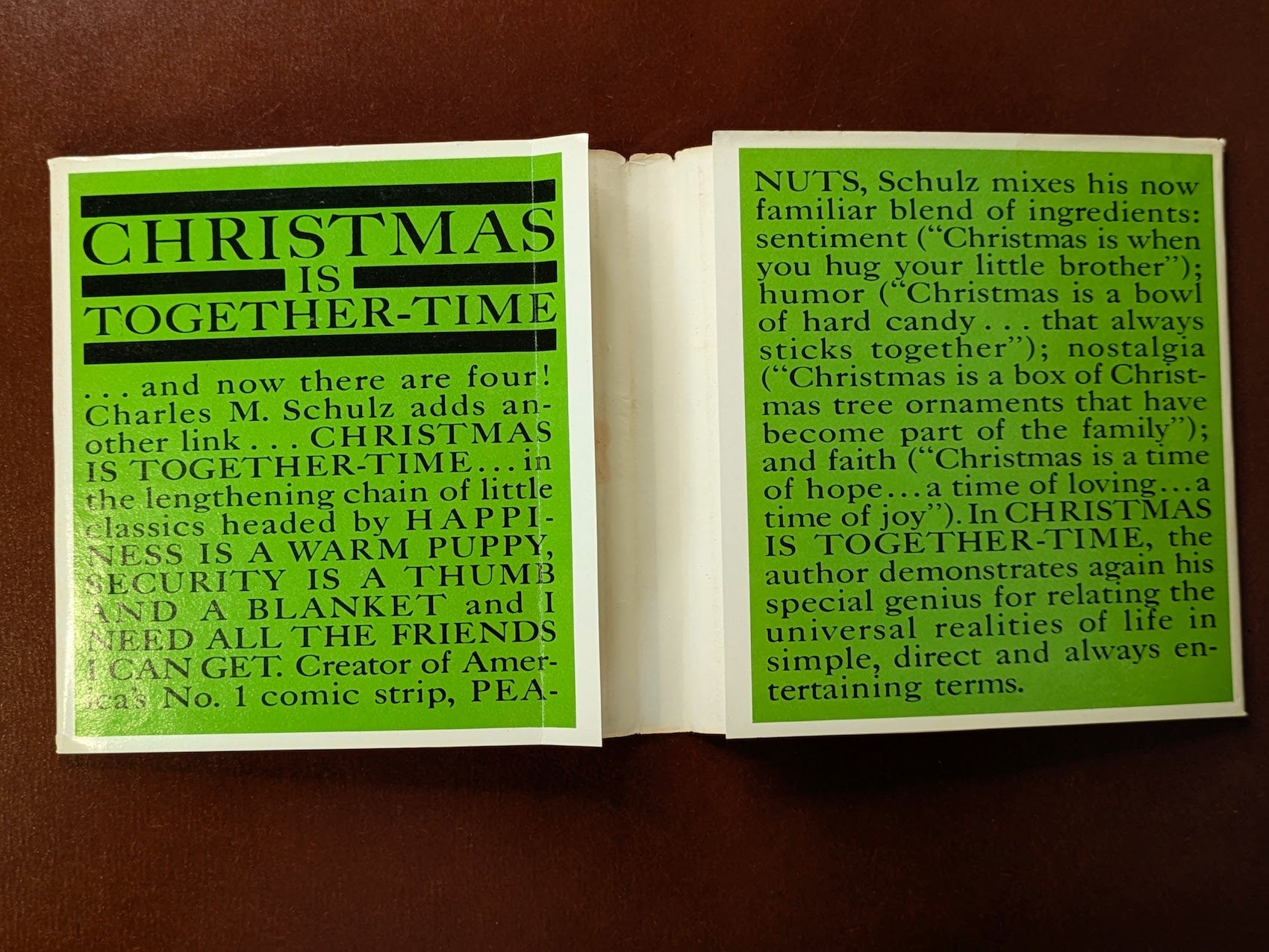 First appearing as a line in a comic strip, Happiness is a Warm Puppy was not only the first original book about Charlie and crew, but was written in one hour and was the best seller of 1963.