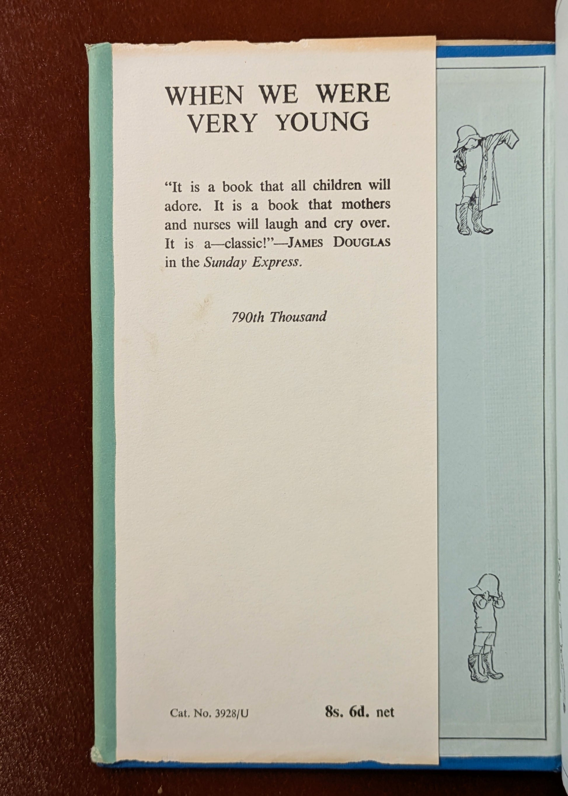Originally published in 1924, the first book of author A.A. Milne When We Were Very Young, is a collection of children's poems in which the popular characters Christopher Robin and Winnie-The-Pooh make their first appearance.