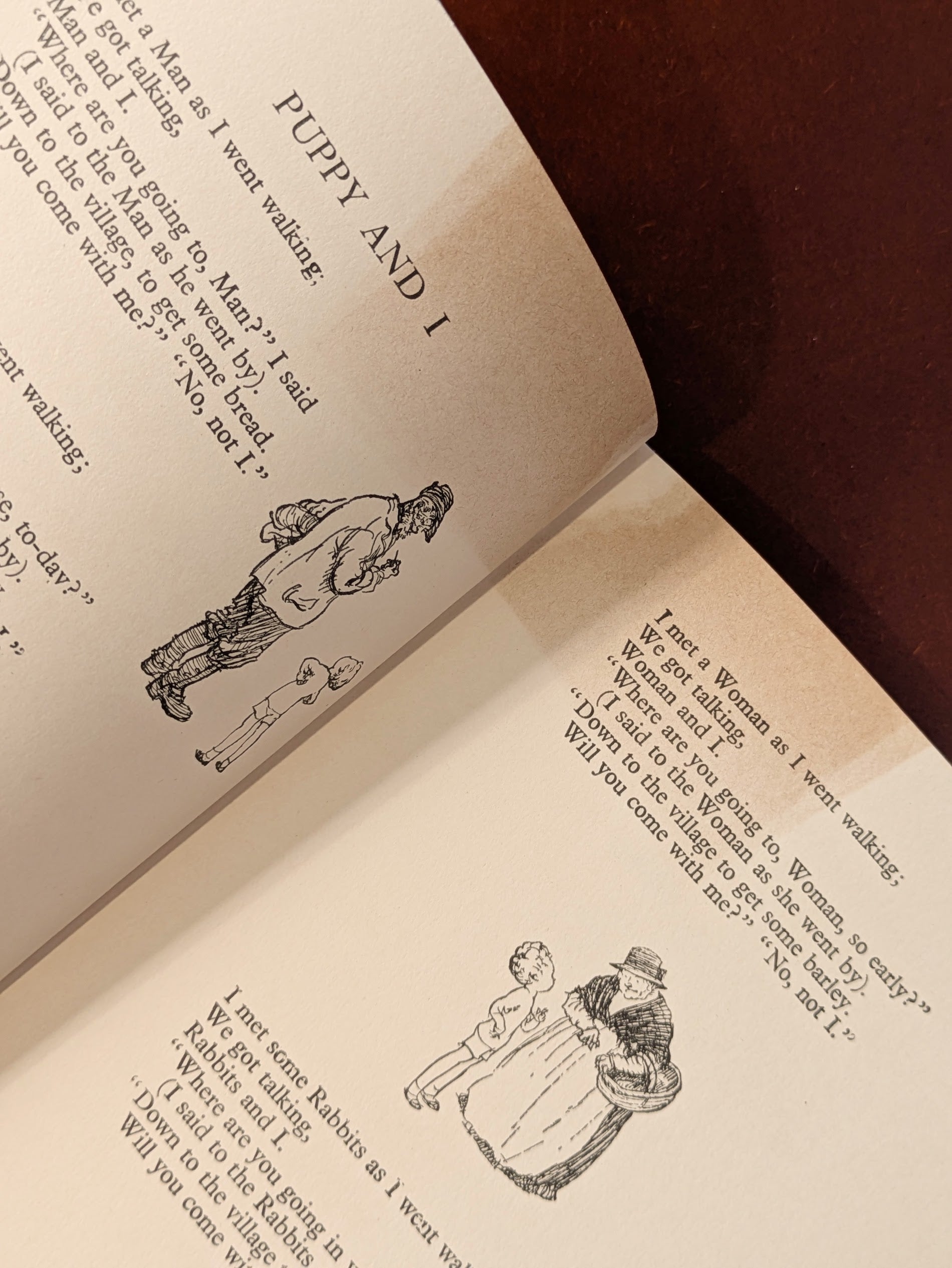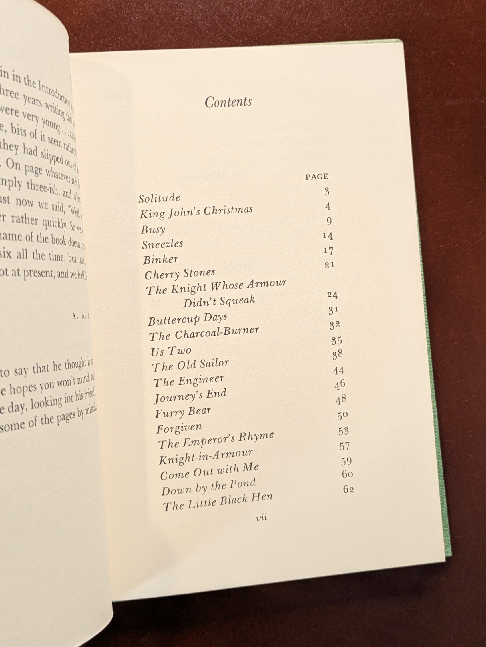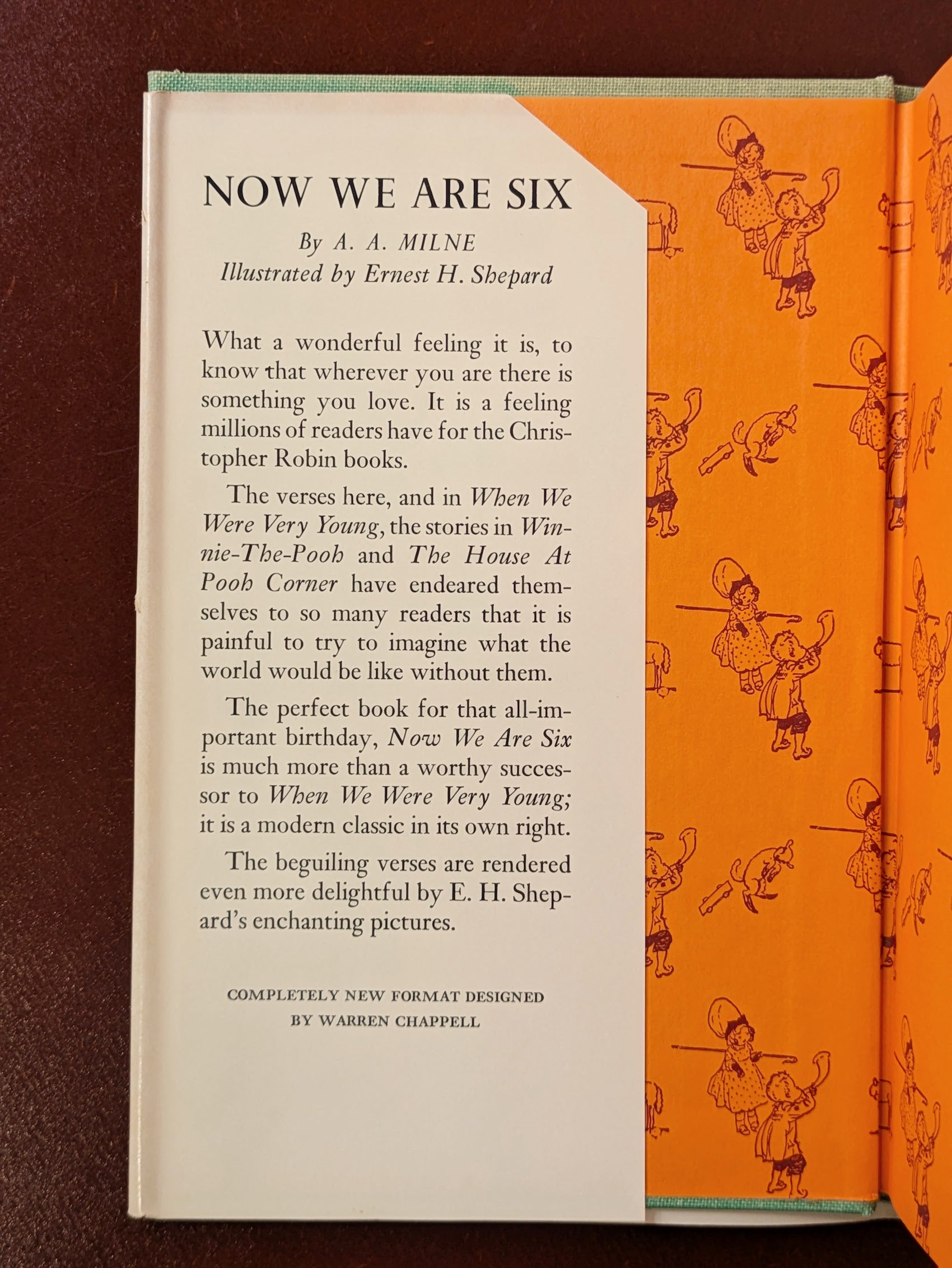 Originally published in 1927 by Methuen & Co. LTD London , Now We Are Six is the second children’s poetry collection from A.A. Milne and the third book in the Pooh Library.