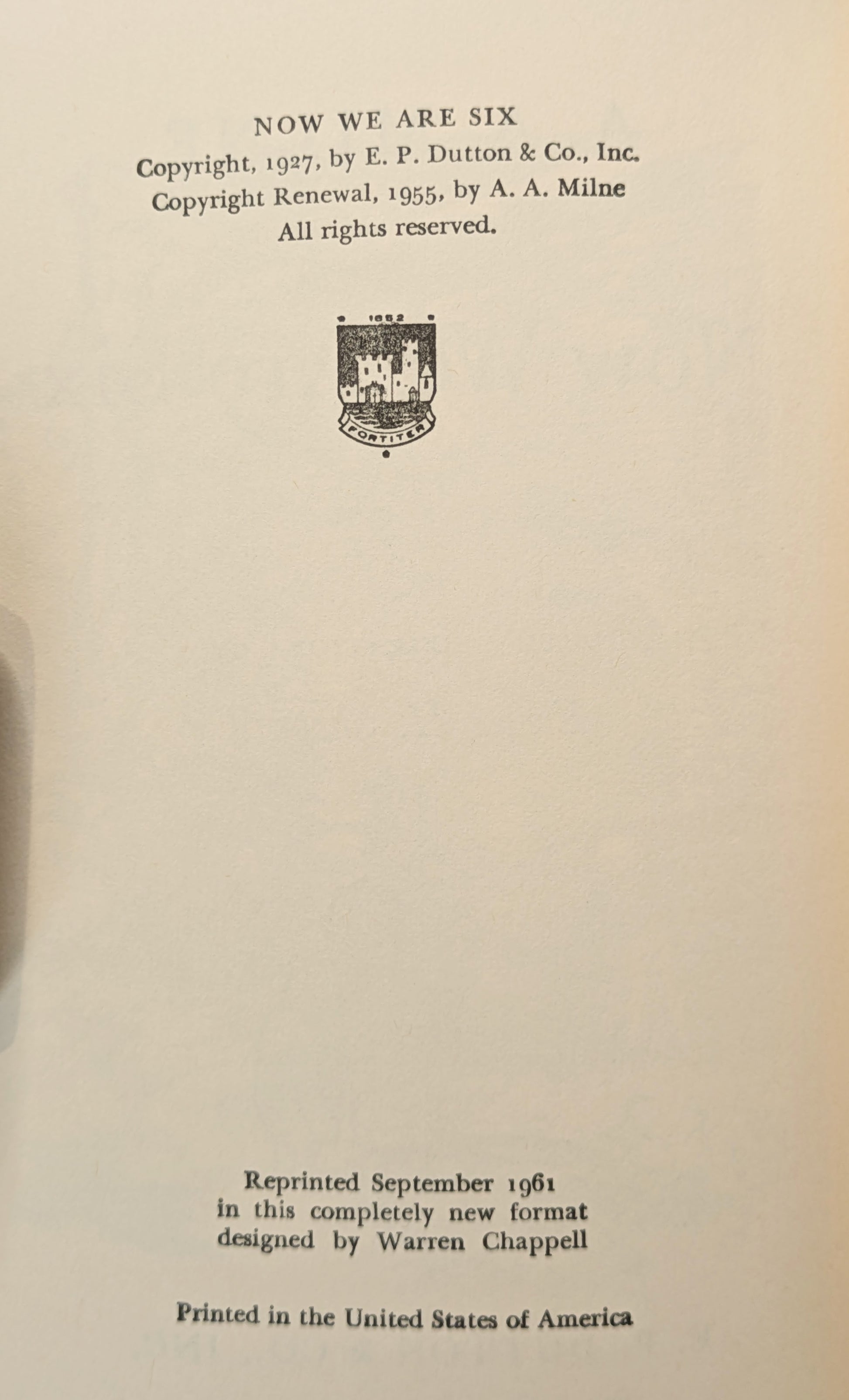 This copy is a 1961 reprint from an American publisher, but with a new format designed by Warren Chappell. Decorations by Ernest H. Shepard.