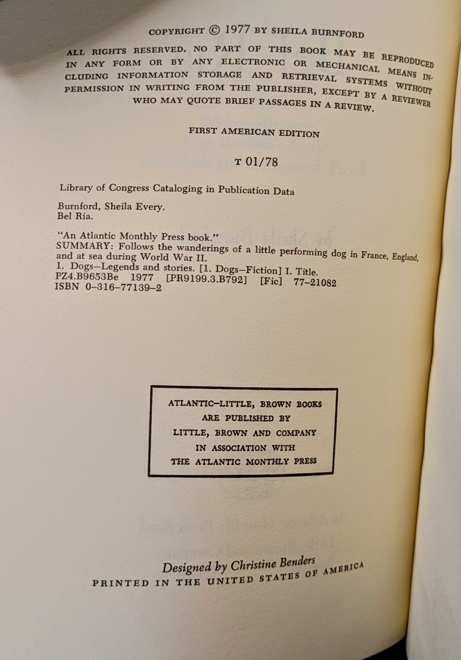 SHEILA BURNFORD "BEL RIA" FIRST US EDITION 1978