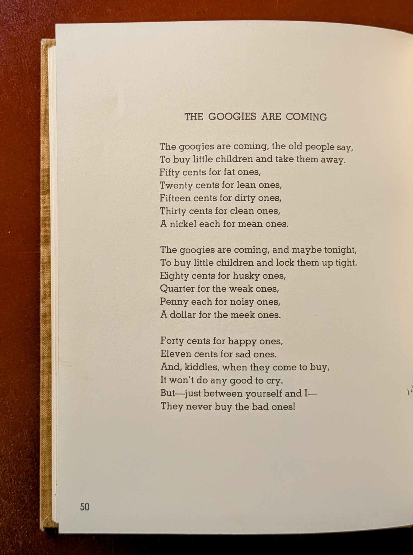 - On page 50 the title says “Googies” instead of the original “Gypsies”. I own a copy from 1979 that still says “Gypsies”, thus this revised printing was done after 1979.