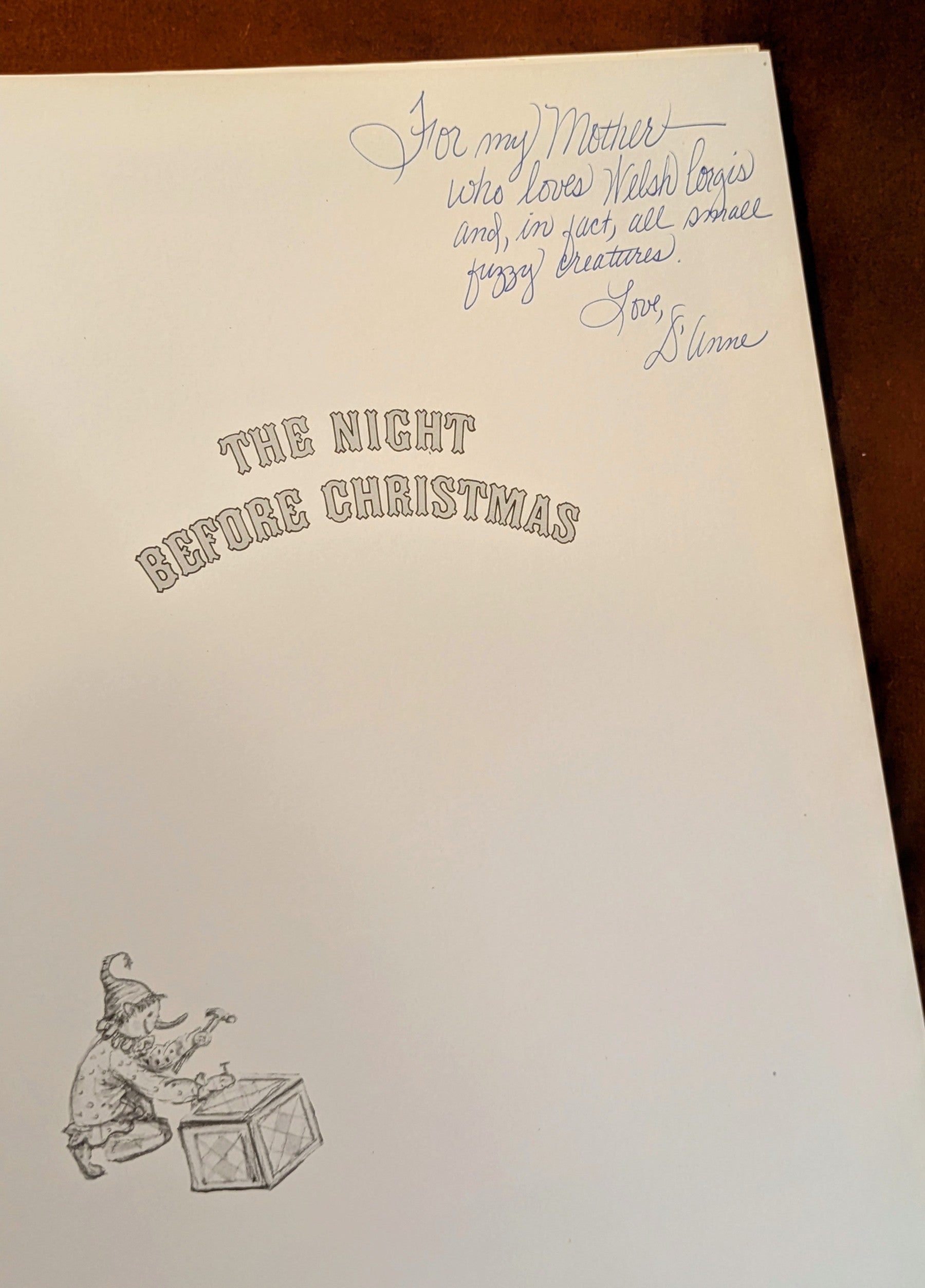 The Night Before Christmas first appeared in 1823 and was later credited to Clement Clarke Moore. The Tasha Tudor illustrated version was originally published in 1975. This copy is the second printing from 1976 and contains a gift inscription that reads; “To my Mother, who loves welsh corgis, and, in fact, all small fuzzy creatures. Love D’anne.”