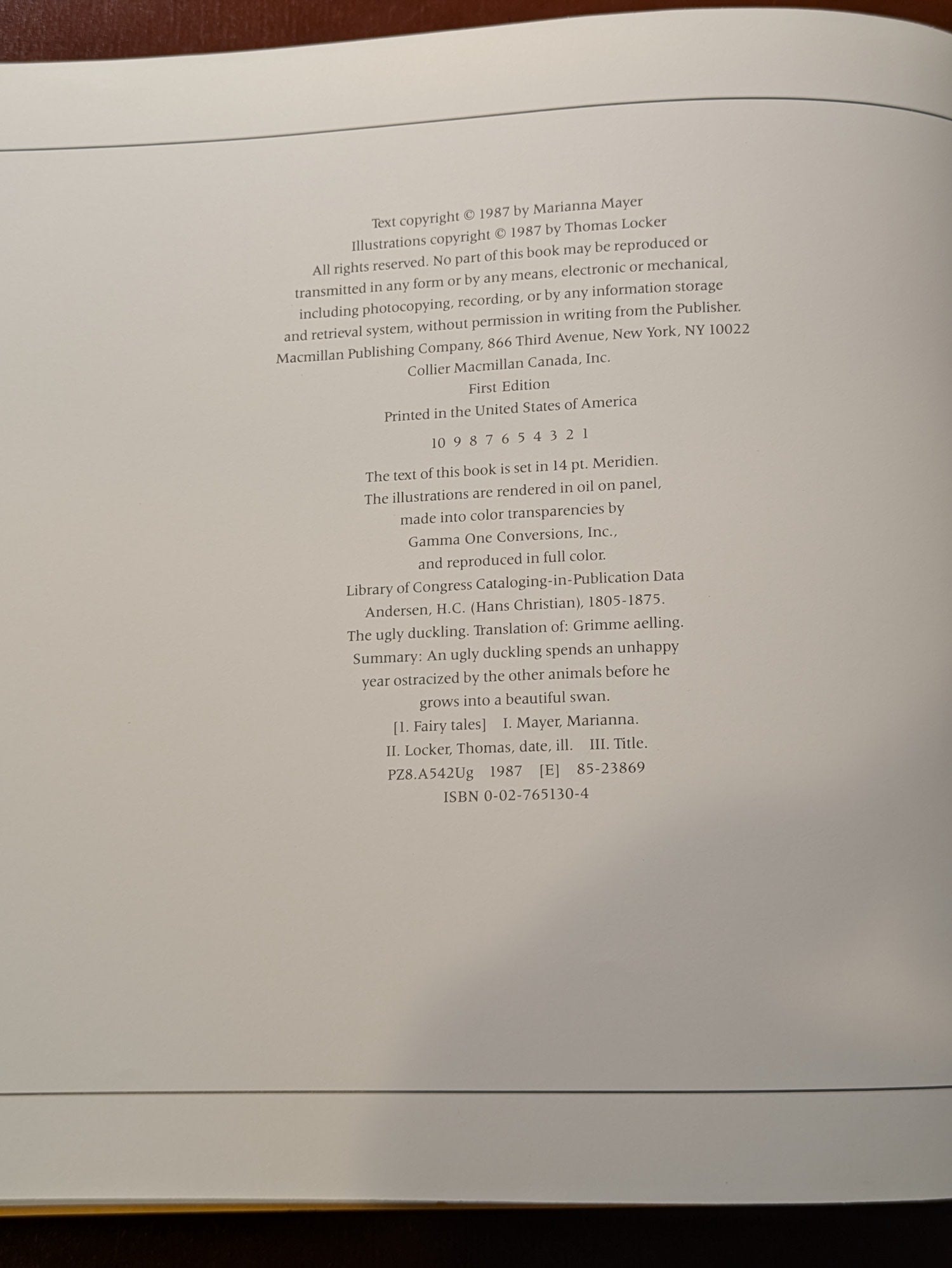 There is no sugar coating this book, it is ugly on the outside, but if you judge this book by its cover, you will miss out on the illustrious and beautiful insides. This First Edition of “The Ugly Duckling” as retold by Marianna Mayer and illustrated by Thomas Locker from 1987, is a modern re-telling of the original Hans Christian Andersen tale from Denmark in 1843. A true underdog story with remarkable illustrations.